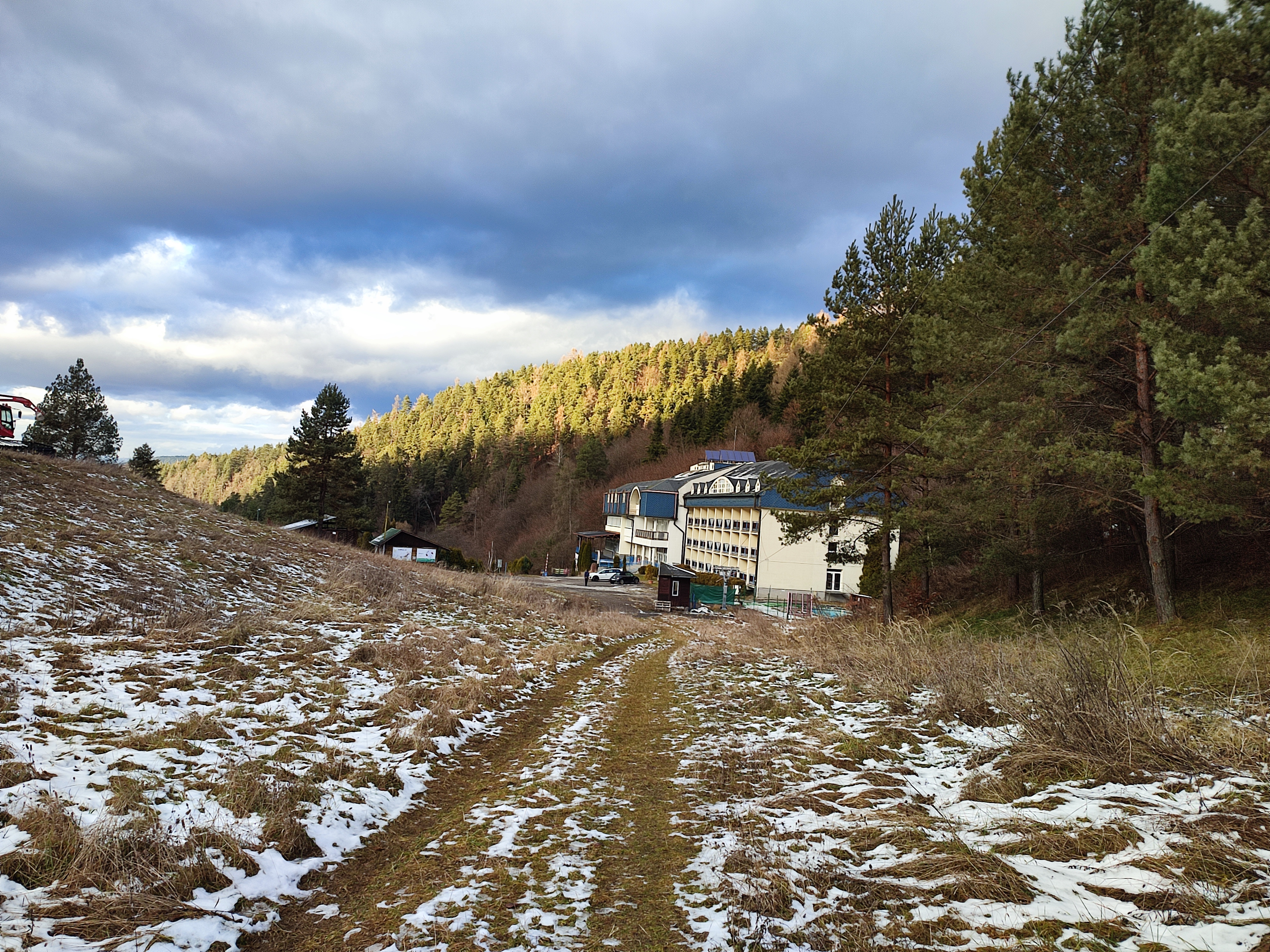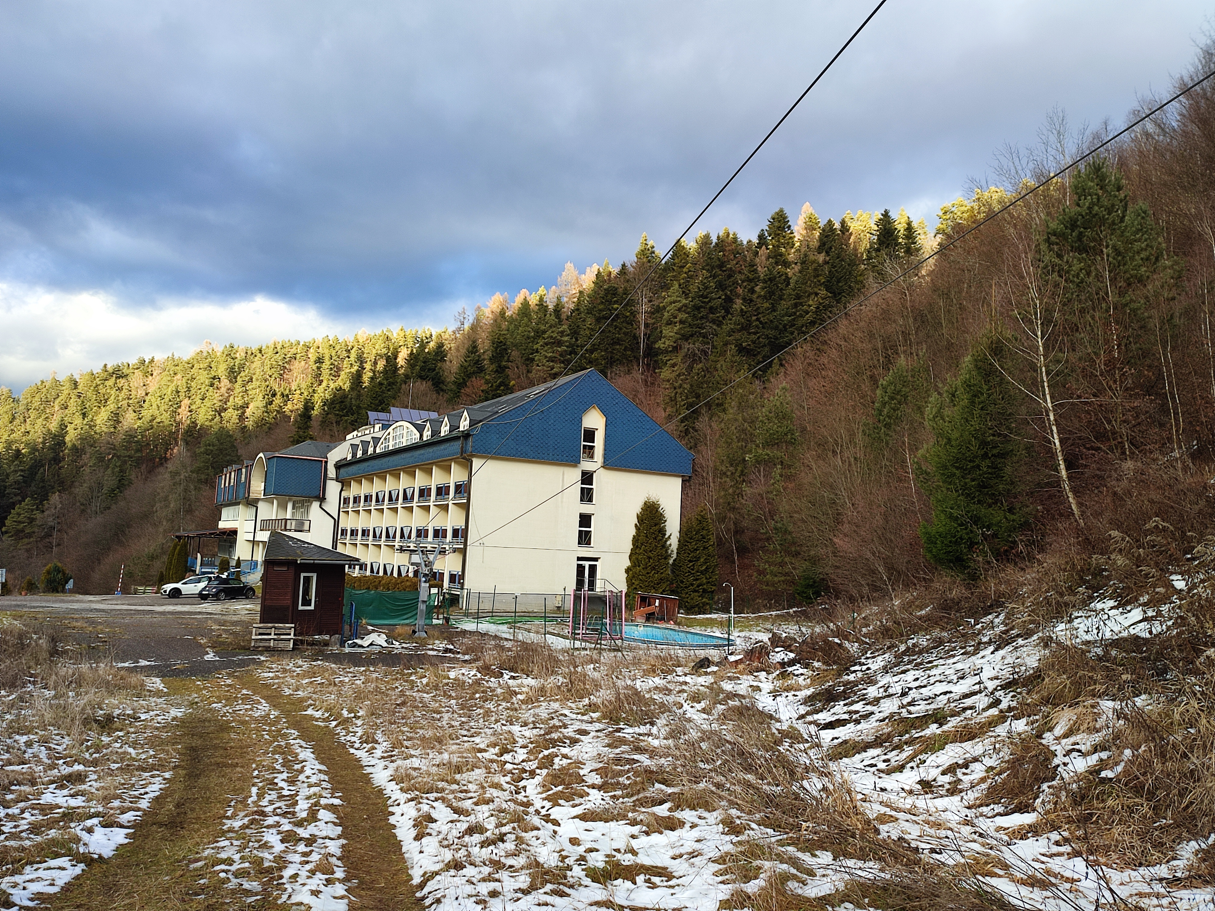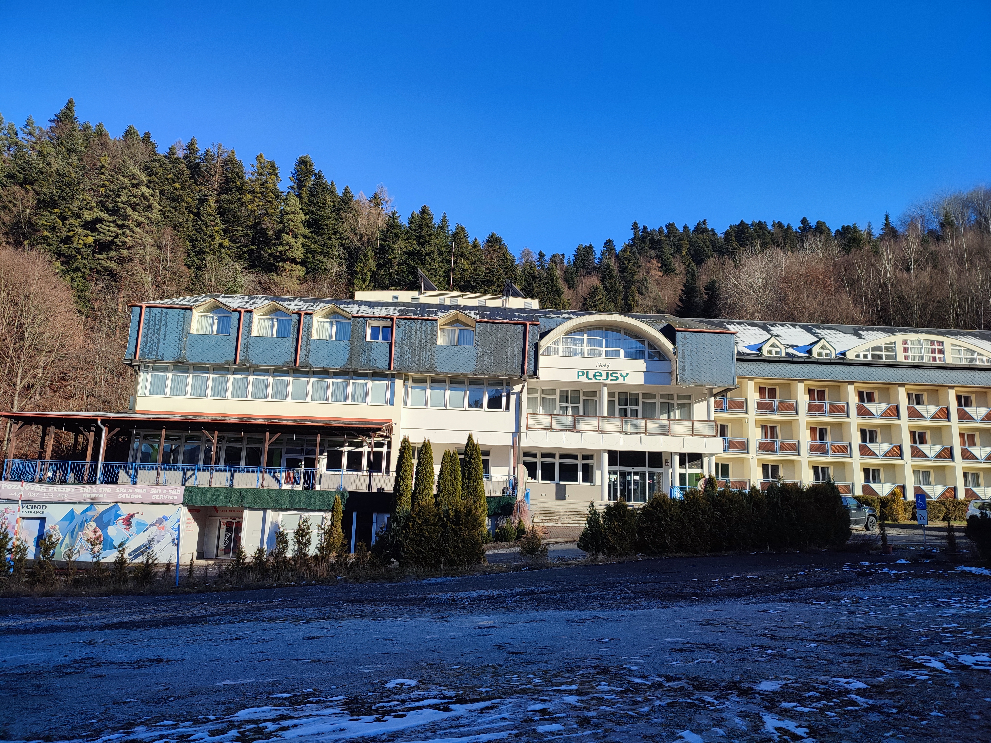 Stavba bez súpisného čísla na parc. č. 3458/21 na ulici Cintorínska č. 1173/3 v k. ú. Krompachy, mimo zastavaného územia obce Krompachy, okres Spišská Nová Ves, postavená na pozemku parc. KN č. 3458/21 je situovaná na celej výmere pozemku na ploche 153 m2, tesne v bezprostrednej blízkosti pri stavbe súp. č. 205 v jej severozápadnom rohu a využíva priestor pod jestvujúcou terasou ako vstavba. V liste vlastníctva nie je predmetná stavba zapísaná, nakoľko vznikla vstavbou pod terasou. Stavba terasy nie je zapísaná na LV, je uvedené na LV len pri pozemku, že na pozemku je postavená budova bez označenia súpisným číslom. Objekt je atypický, pravidelného pôdorysného tvaru “L”, je prízemný jednopodlažný a je prevádzkovo prepojený s hlavnou stavbou hotela súp. č. 205. Objekt bol dodatočne postavený pod priestorom terasy po roku 2006 a bol využívaný ako SKI servis. K tejto dodatočne realizovanej vstavbe pod terasou neboli znalcovi poskytnuté žiadne doklady, podklady a dokumentácia z jej realizácie. Terasa je uložená na stĺpovej zvislej nosnej kovovej konštrukcii a je zastrešená prístreškom z drevenej konštrukcie a je situovaná na pozemku parc. č. 3458/21. Terasa nie je zahrnutá v prvotnej projektovej dokumentácii. Terasa je prístupná z budovy hotela Plejsy súp. č. 205 z bowllingovej miestnosti č. 1.07 a tiež z predsadeného hlavného schodiska.